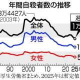 【年間自殺者数、1978年の統計開始以来、初めて2万人を下回る】 厚生労働省 「中高年男性の自殺が減少しており、事業不振や負債を動機とする件数も減っている。経済動向が影響した可能性がある」ニュース速報+19826.22026/01/29 11:12:04
